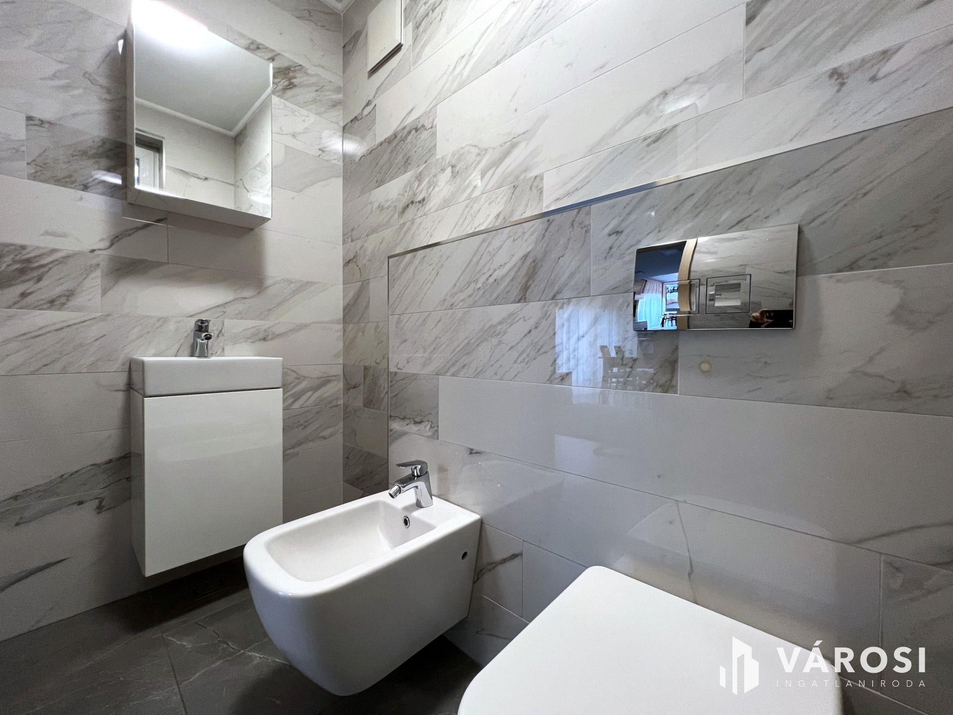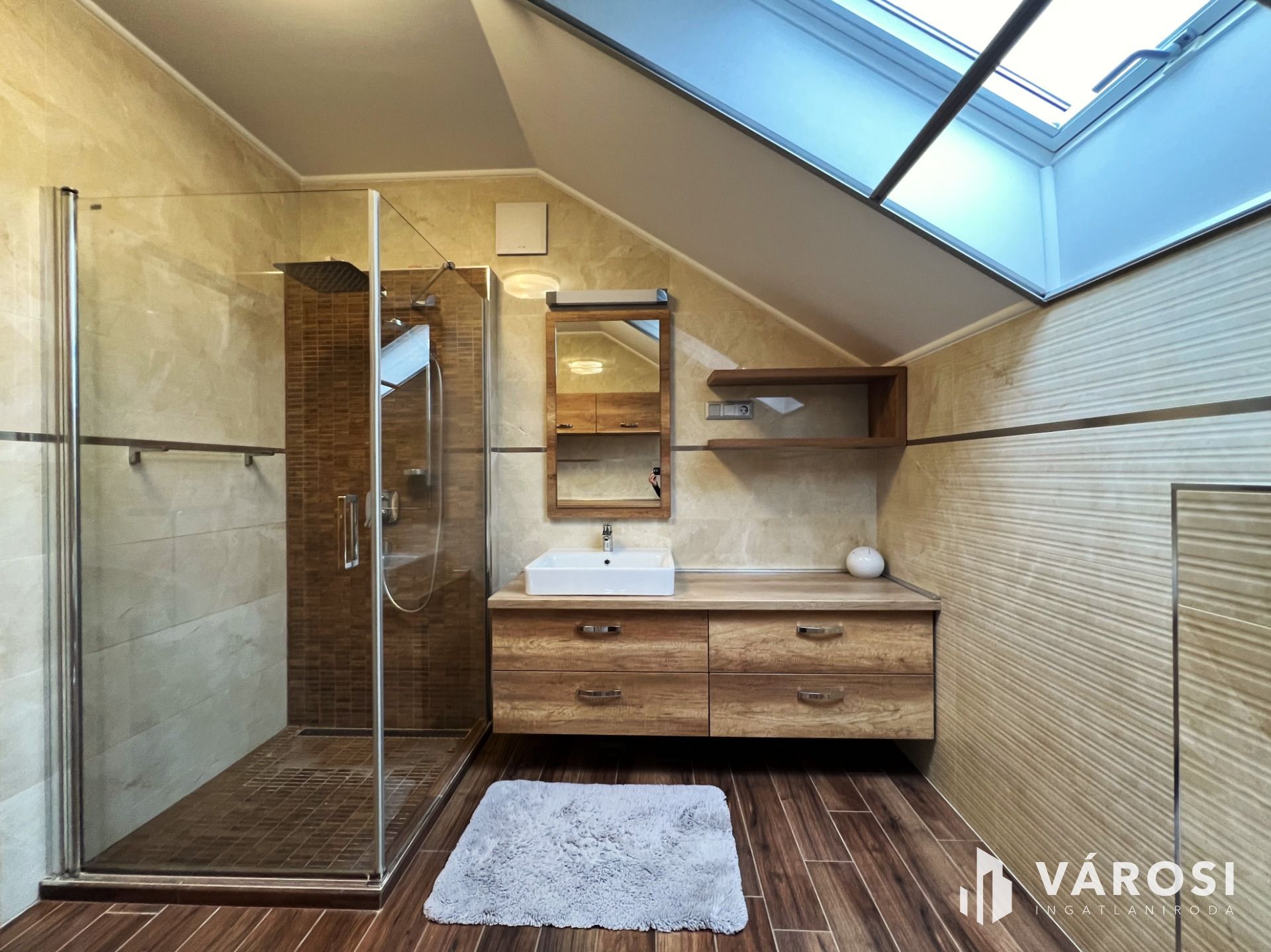 A földszinten található egy minden igényt kielégítő amerikai konyhás nappali, egy tágas kádas fürdőszoba wc-vel, gardrób, külön wc-bidé, közlekedő-mély pakolható gardrób szekrényekkel, továbbá egy világos modern hálószoba.