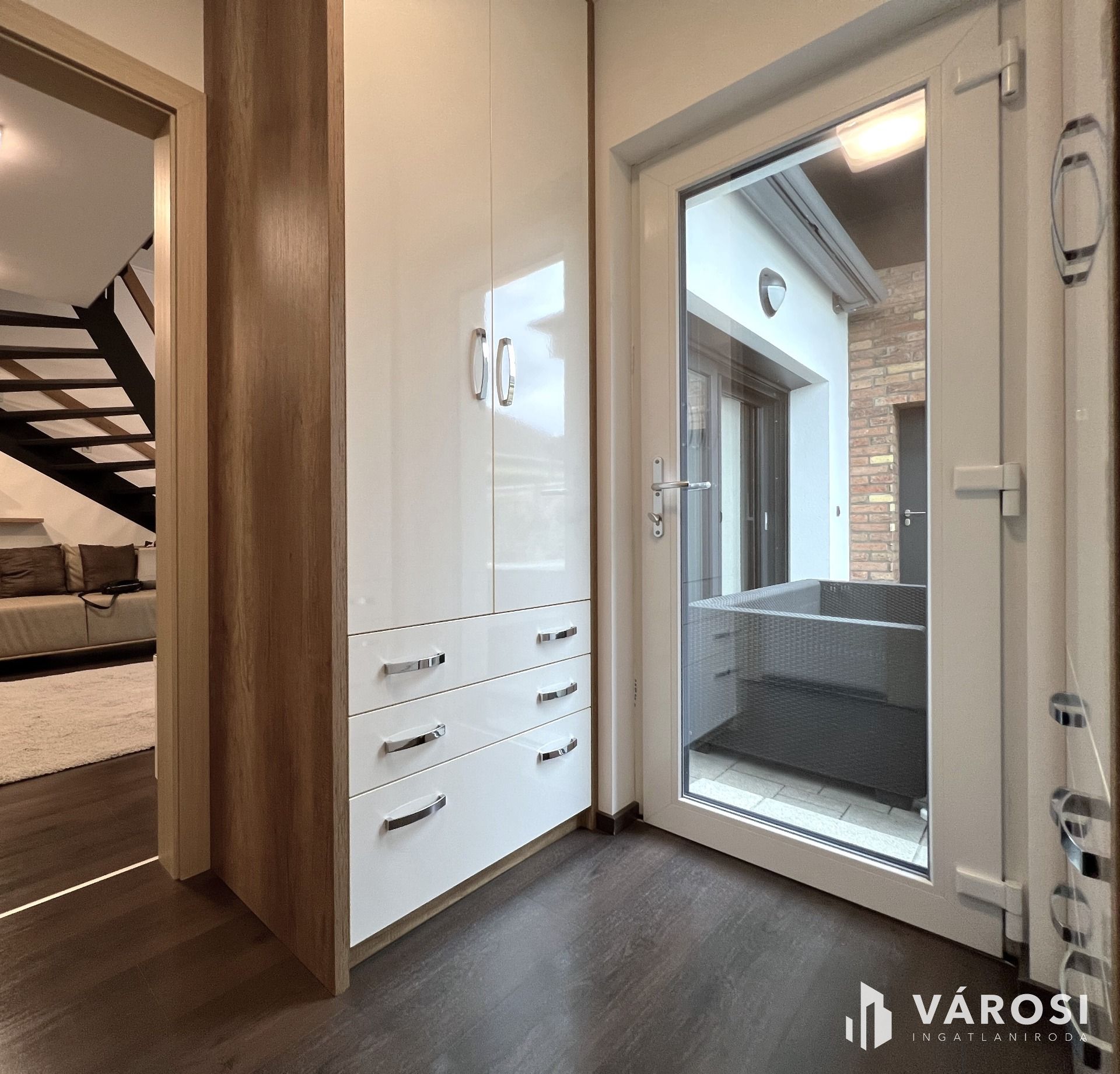 Minden helyiség bútorozott, nagyon szép anyagok, falburkolatok kerültek felhasználásra. A nappaliból az emeletre egy minimál tervezésű modern lépcsőn juthatunk, ahol üveg korlátok teszik még elegánsabbá, légiesebbé a teret.