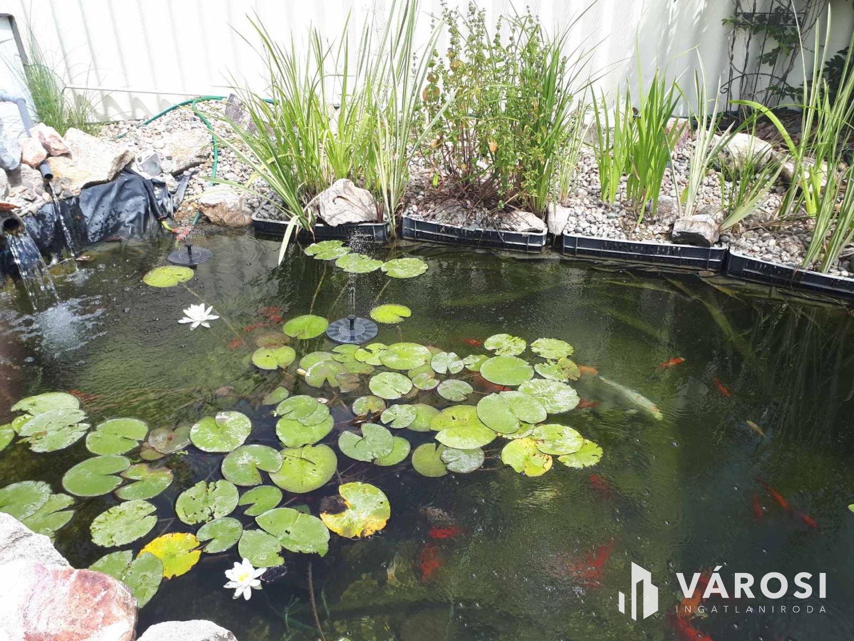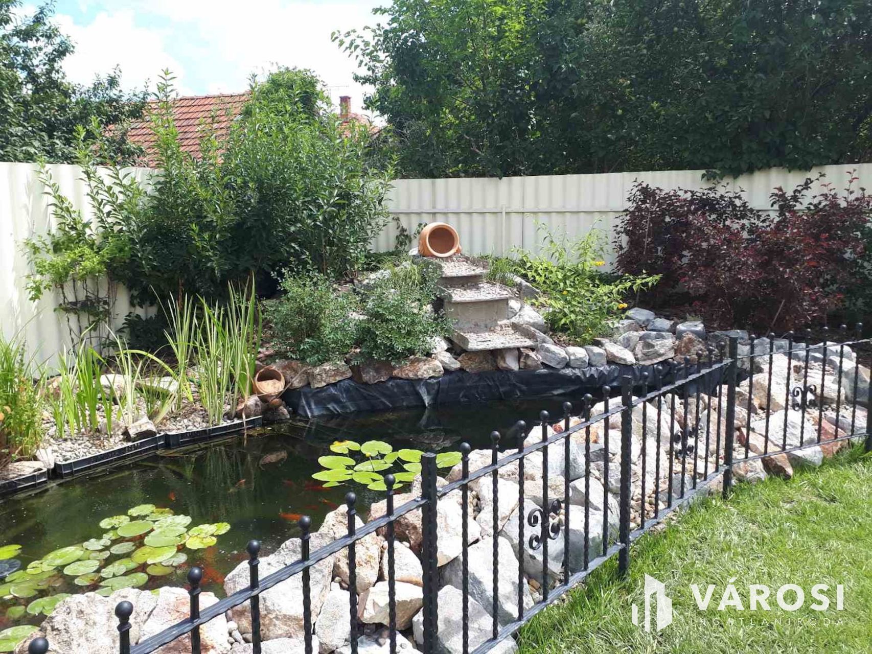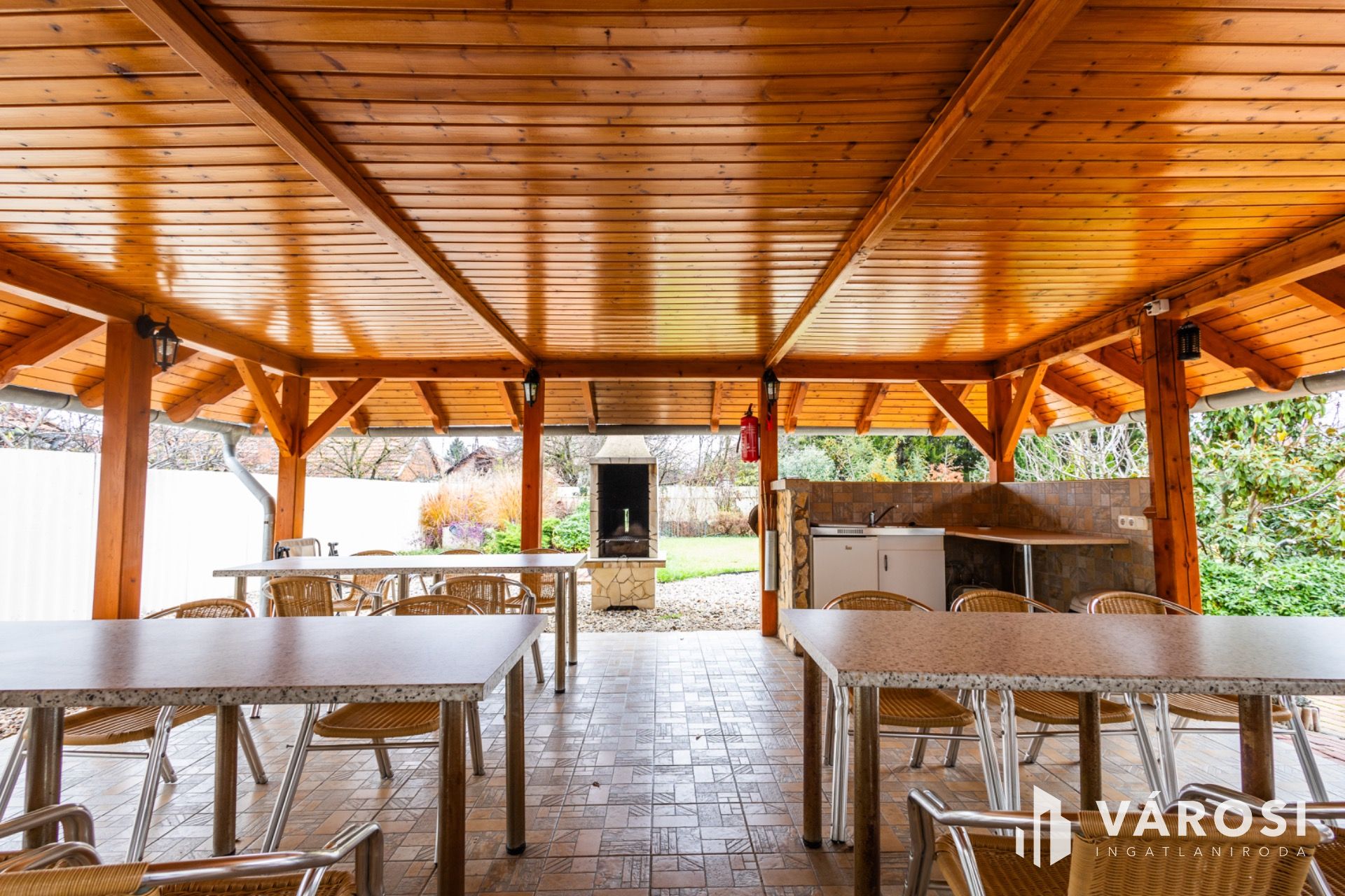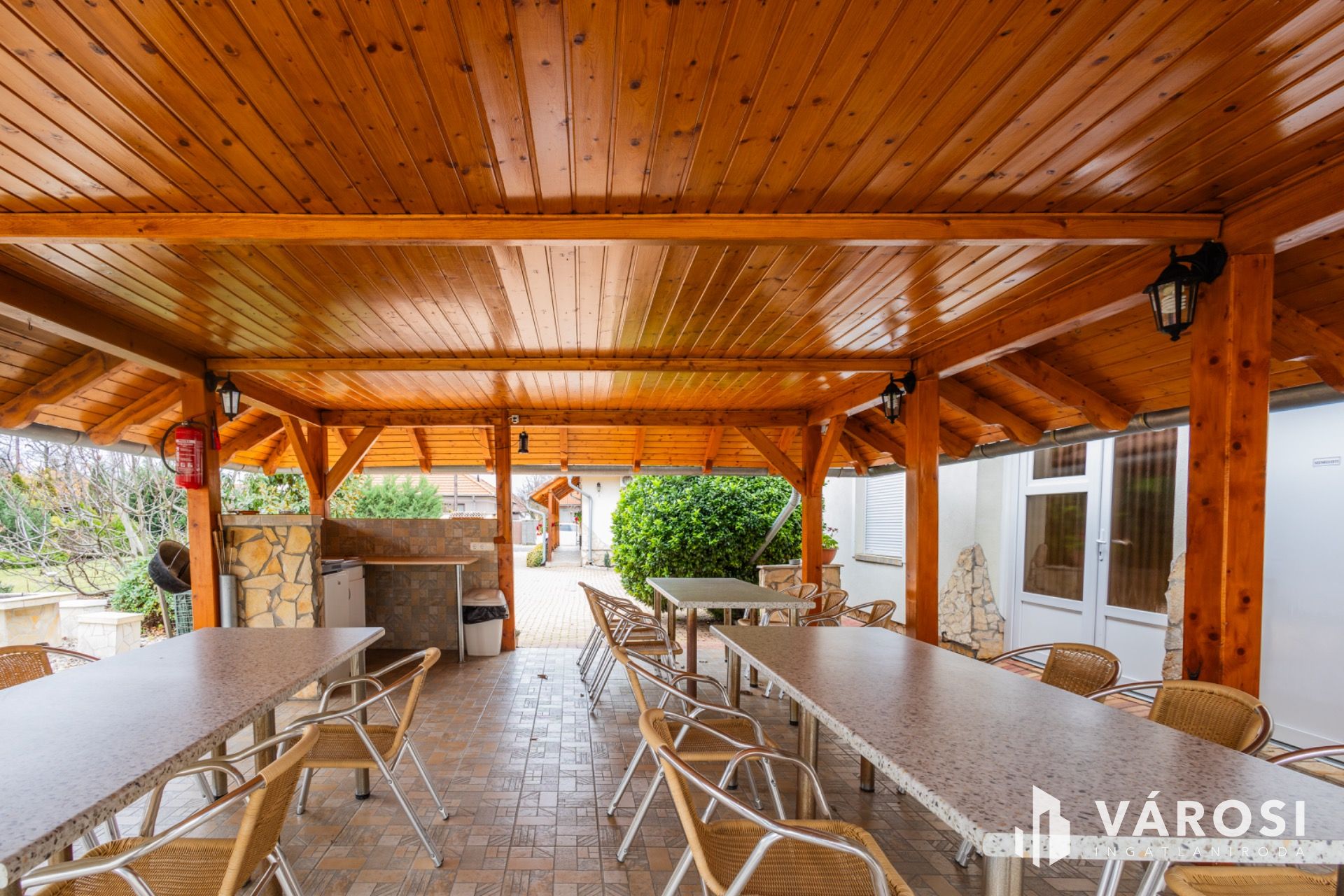 A tágas kertben a fedett terasz és gyermekjátszó mellett egy filagória is megtalálható, melyben szalonnasütő és grillező is ki lett alakítva. A duplatelken egy kertitó és számos dísznövény is helyet kapott, ez utóbbi öntözése fúrott kútról működtetett öntözőrendszerrel megoldott. Emellett 8 autó számára alkalmas beálló is kialakításra került. A telek méretéből adódóan igénytől függően további beépítésre is lehetőség van.