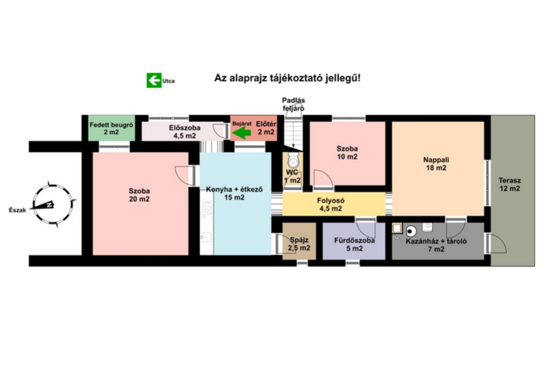 A ház hasznos alapterülete 100 m2, melyhez tartozik még elkerített saját udvarrész amely kb.: 100 m2, és egy fedett terasz.