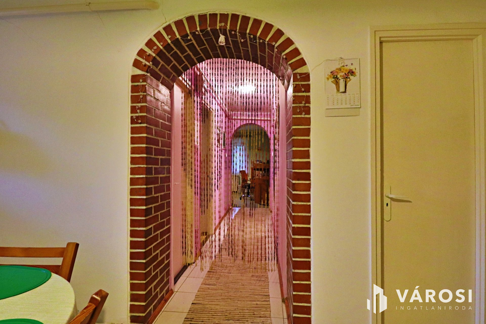 A házba előszobán keresztül egy tágas konyha-étkezőbe léphetünk be, ahonnan nyílik egy hálószoba, ill. folyosó, ezen keresztül juthatunk el a kisebbik szobába, fürdőszobába, különálló WC-be, illetve a nappaliba. Ezen kívül a konyhából nyílik az éléskamra, a nappaliból pedig a kazánházba tudunk menni, melyen keresztül jutunk ki a teraszra és a saját kertrészre.