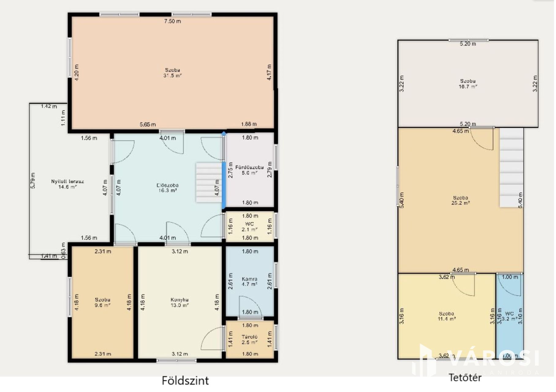 A tetőtérbe fa lépcsőn lehet feljutni ahol egy dolgozószoba és két hálószoba kapott helyet. A tetőtéri részben is ki lett alakítva egy mosdó , WC helyiség melyben akár egy zuhanyzó is kialakítható.