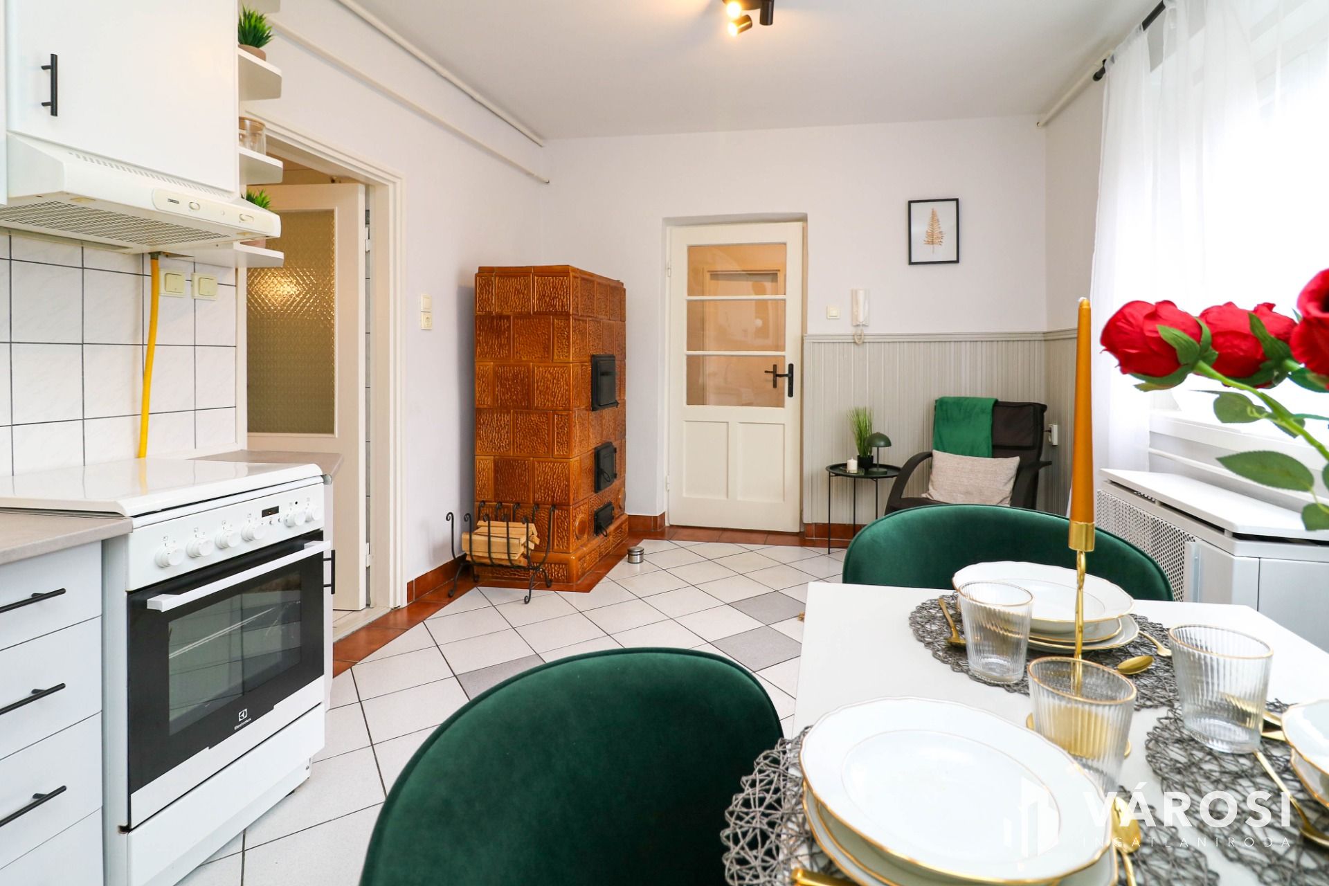 A ház fűtése konvektoros, de működő csempekályha is rendelkezésre áll – hangulatos és alternatív fűtési megoldásként is használható.