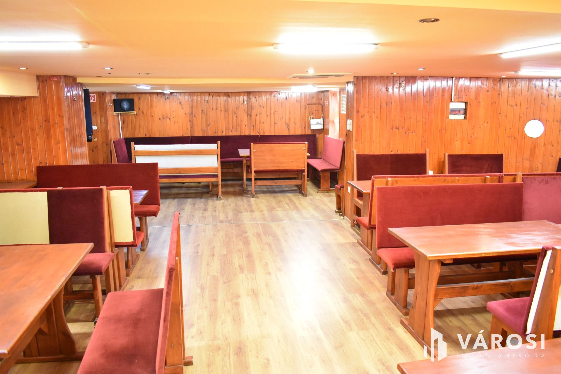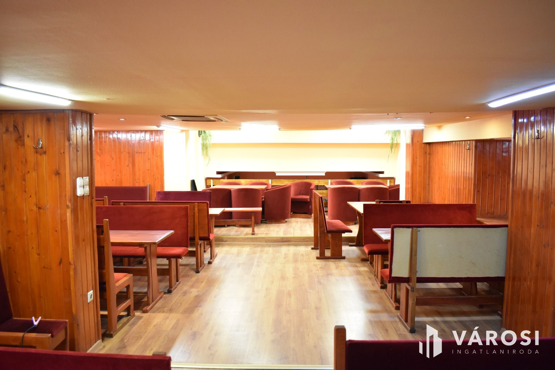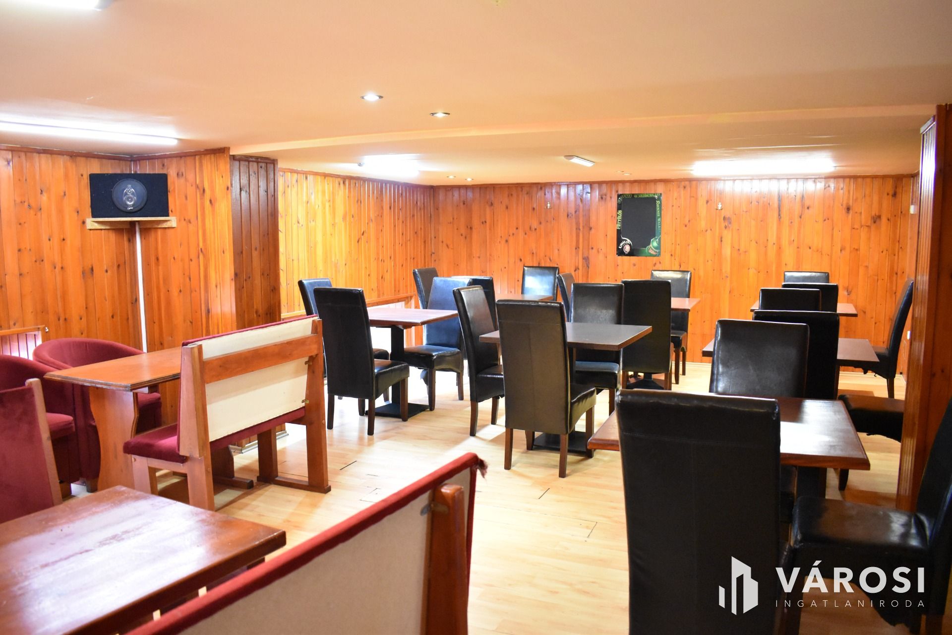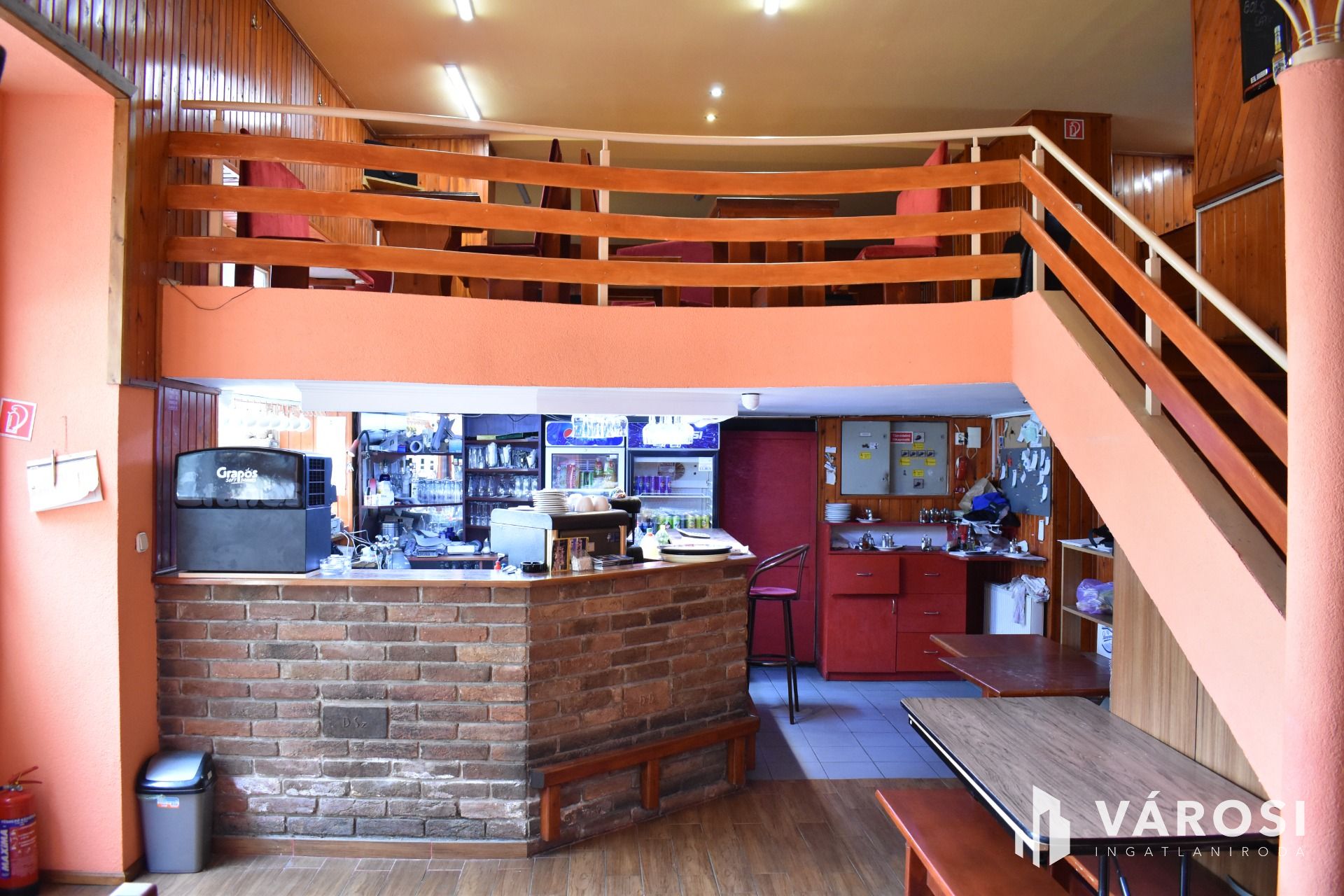 Az ingatlan földszinti részén lett kialakítva egy hangulatos és minden igényt kielégítő bárpult, egy éttermi vendéglátó rész, amely a kialakított szintén hangulatos galéria résszel közel 200 fő befogadásra alkalmas. A galéria rész ebből 104 fő befogadásra alkalmas, ahol a kialakításának köszönhetően zártkörű rendezvények lebonyolítására is tökéletesen alkalmas. A vendéglátó részen a közelmúltban lettek felújítva a vizesblokk (mosdó, WC) helységek is, amelyből 3 db. található az éttermi részen (férfi, női és mozgáskorlátozott). A vendéglátó egységhez tartozik egy hatalmas és modern eszközökkel felszerelt konyha, amely több részből áll, itt lett kialakítva egy pizza készítő, melegkonyha, előkészítő, mosogató, illetve több hűtő, raktár és mosdó helység is. A fűtésről 3 db gázkazán lapradiátorokkal, padlófűtéssel, a hűtésről klímaberendezések gondoskodnak. A vendéglátó részen az elektromos hálózat is korszerű, itt 3 x 72 A és ipari áram található.