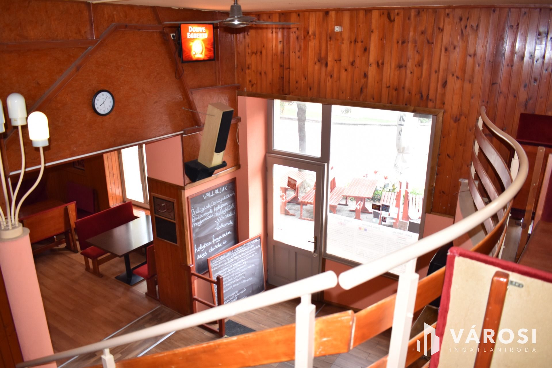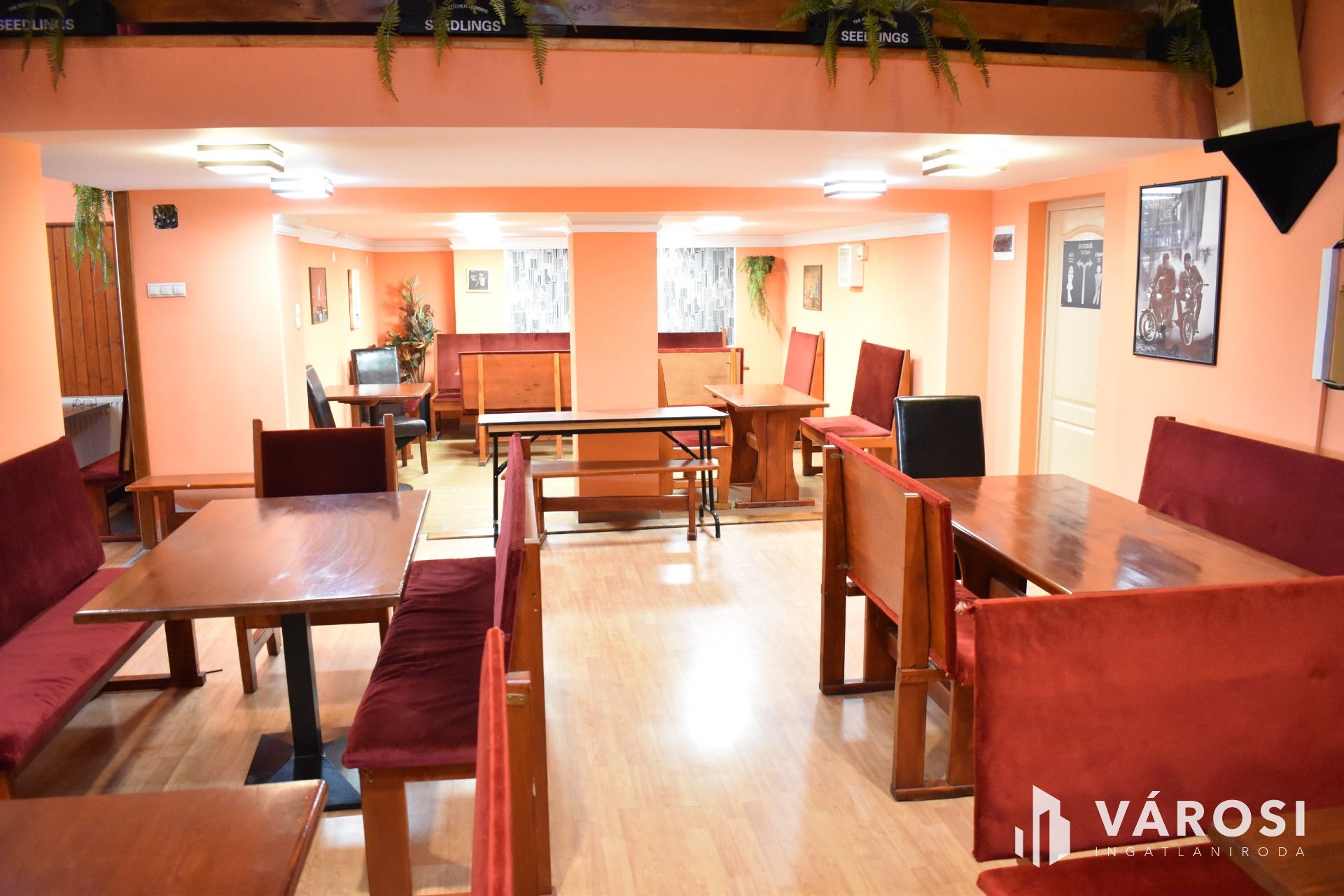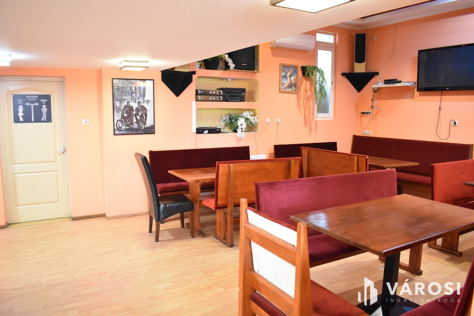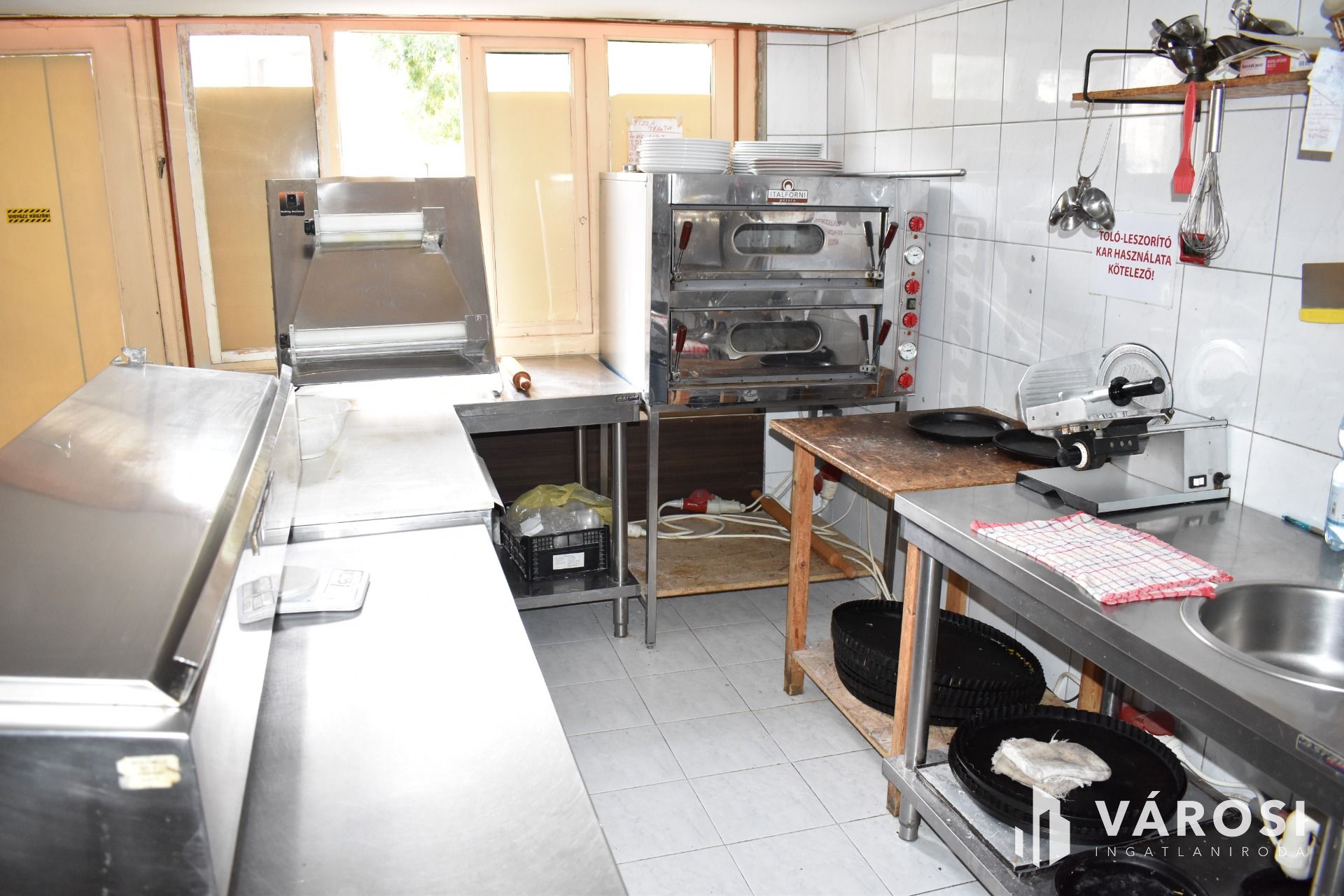 Az ingatlan földszinti részén lett kialakítva egy hangulatos és minden igényt kielégítő bárpult, egy éttermi vendéglátó rész, amely a kialakított szintén hangulatos galéria résszel közel 200 fő befogadásra alkalmas. A galéria rész ebből 104 fő befogadásra alkalmas, ahol a kialakításának köszönhetően zártkörű rendezvények lebonyolítására is tökéletesen alkalmas. A vendéglátó részen a közelmúltban lettek felújítva a vizesblokk (mosdó, WC) helységek is, amelyből 3 db. található az éttermi részen (férfi, női és mozgáskorlátozott). A vendéglátó egységhez tartozik egy hatalmas és modern eszközökkel felszerelt konyha, amely több részből áll, itt lett kialakítva egy pizza készítő, melegkonyha, előkészítő, mosogató, illetve több hűtő, raktár és mosdó helység is. A fűtésről 3 db gázkazán lapradiátorokkal, padlófűtéssel, a hűtésről klímaberendezések gondoskodnak. A vendéglátó részen az elektromos hálózat is korszerű, itt 3 x 72 A és ipari áram található.