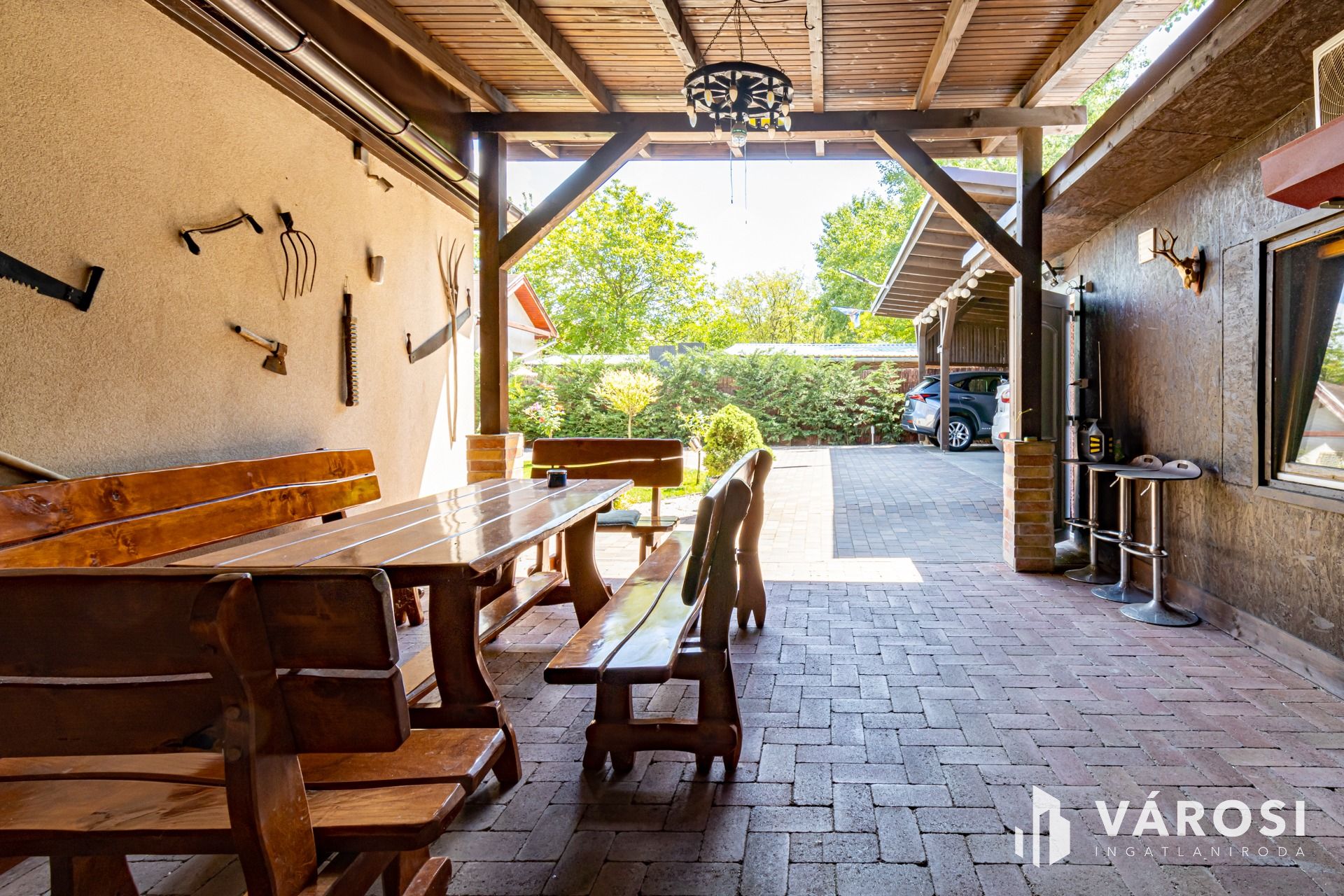 Ki lett alakítva egy három állásos, fedett autóbeálló, egy kemence, grillező és bográcsozó is, ami szintén fedett és mellé egy sörpados étkező is el tudott férni.