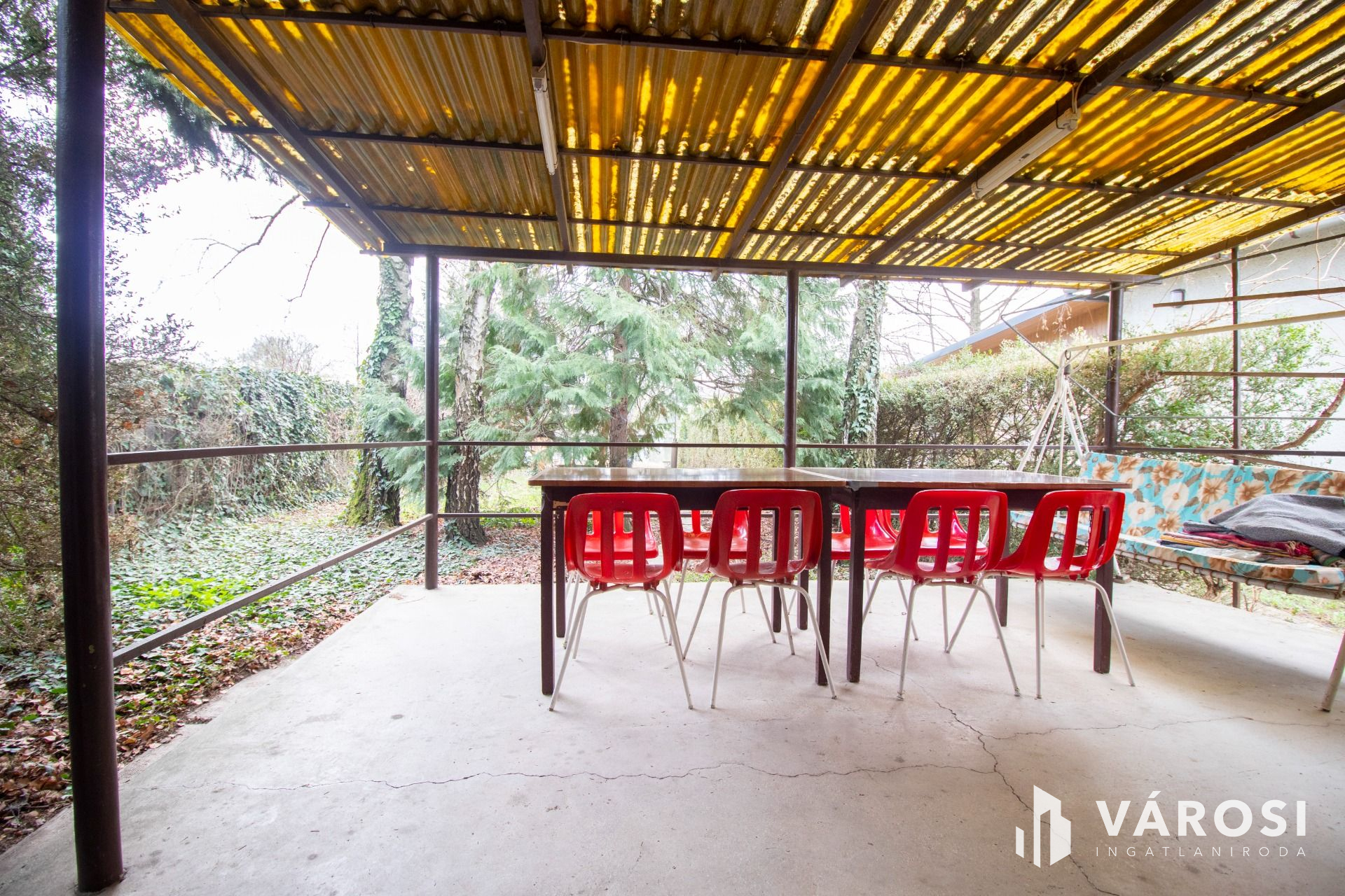 Az épülethez két nagyméretű fedett terasz, illetve egy - akár három autó elhelyezésére is alkalmas - fedett gépkocsibeálló is tartozik.
