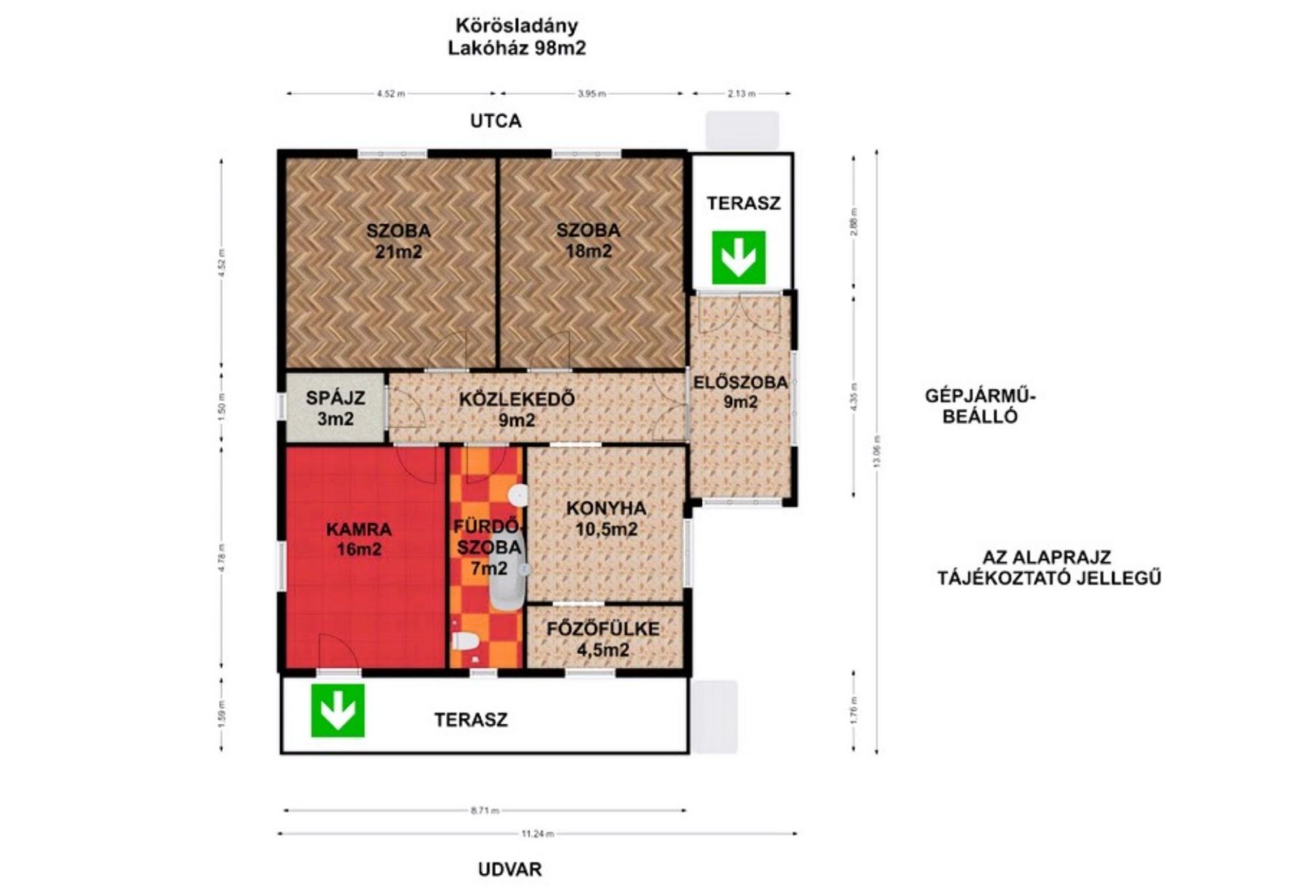 + 98m2 lakóház, 20m2 hátsó fedett terasz, 15m2 beton alapra épített, könnyűszerkezetes garázs, 798m2 ideális méretű telek.