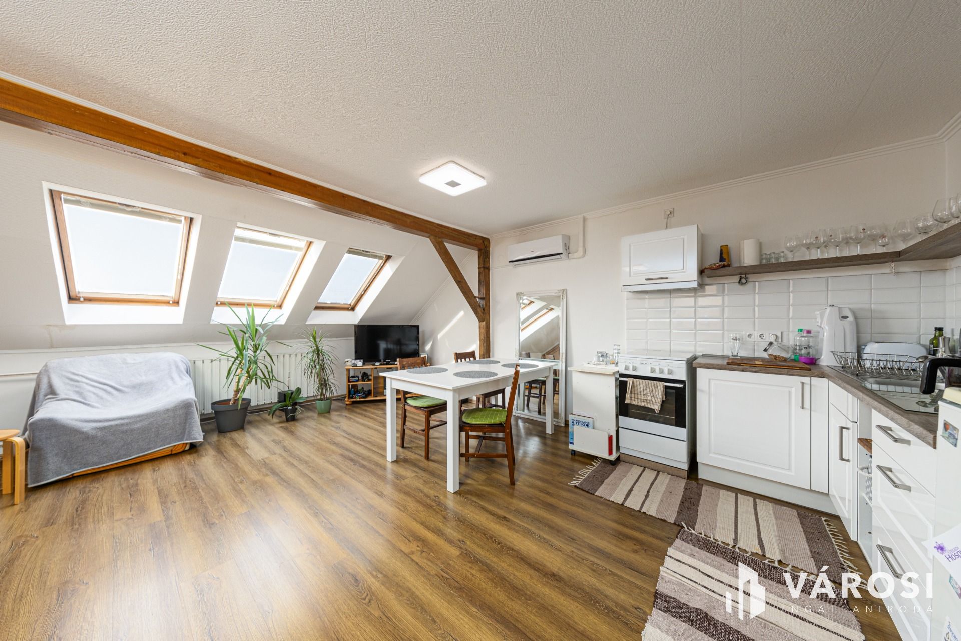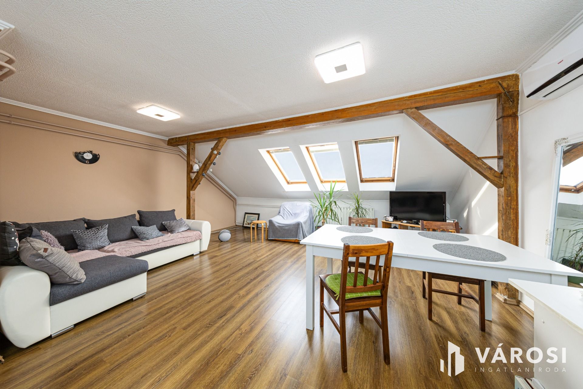 Látszó fagerendás tetőtéri lakás csendes utcában