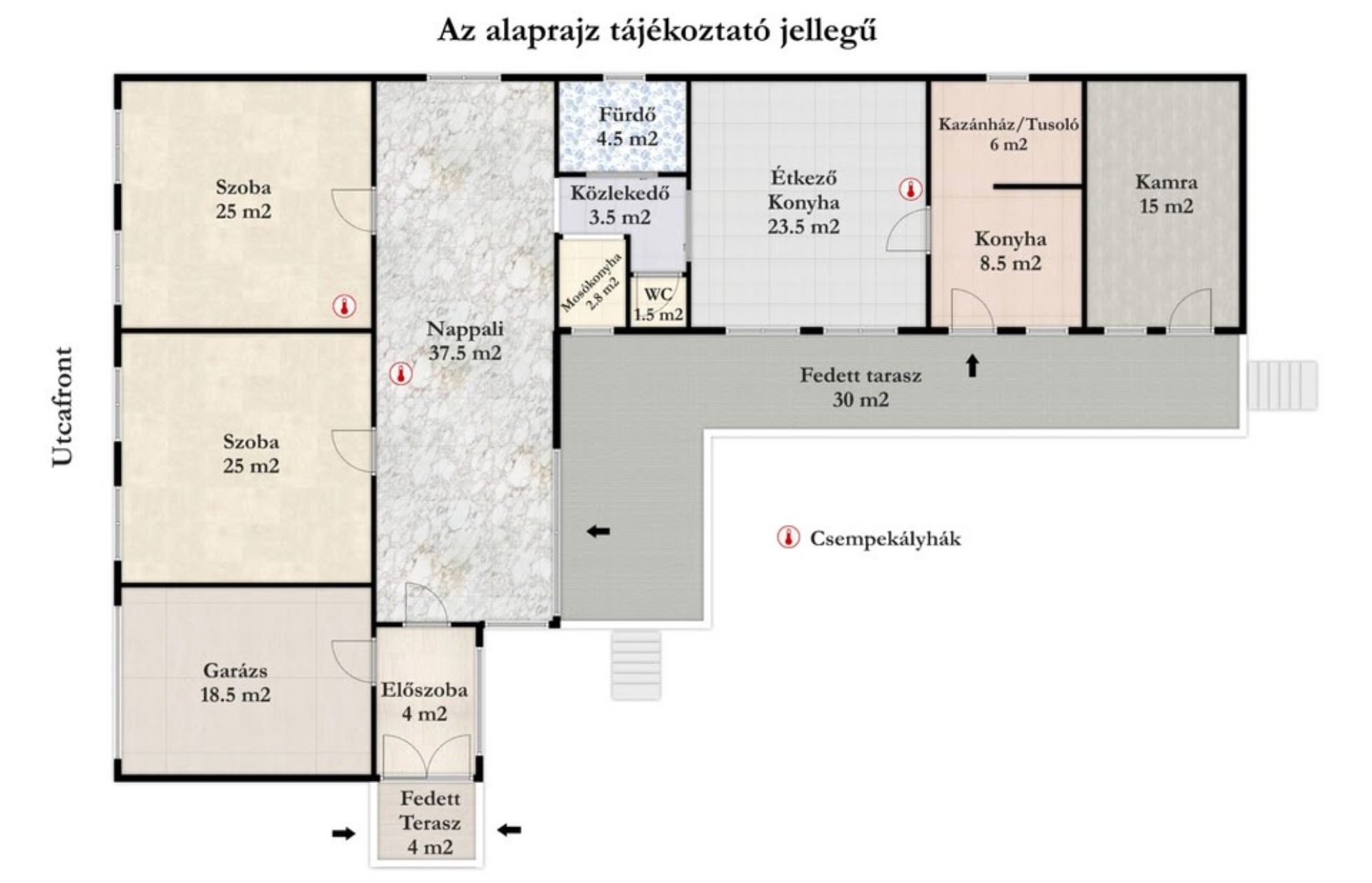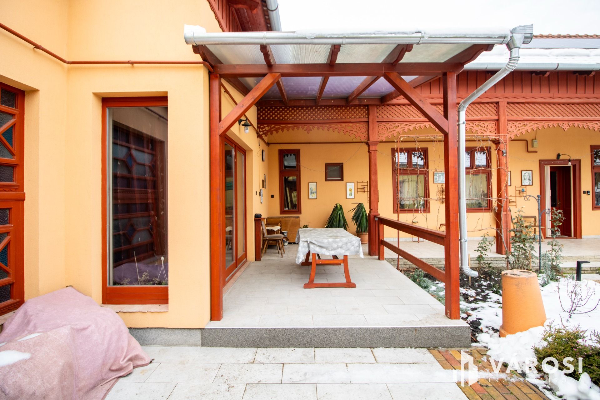 Az ingatlan egyik legnagyobb értéke a korhűen megőrzött, díszes, L alakú, fedett veranda, amely közel 40 négyzetméteren ad elegáns érkezést és klasszikus polgári hangulatot. A belső terek tágasak, jól átláthatók, a 195 négyzetméteres lakótérben minden helyiség nagyvonalúan méretezett. A ház két bejárattal rendelkezik, az utcafront felől pedig egy épületen belüli, 18,5 négyzetméteres, elektromos kapuval felszerelt garázs nyílik, amely közvetlen kapcsolatban áll az előszobával – ez a belvárosban, nagypolgári ingatlanoknál különösen ritka és rendkívül kényelmes megoldás.
