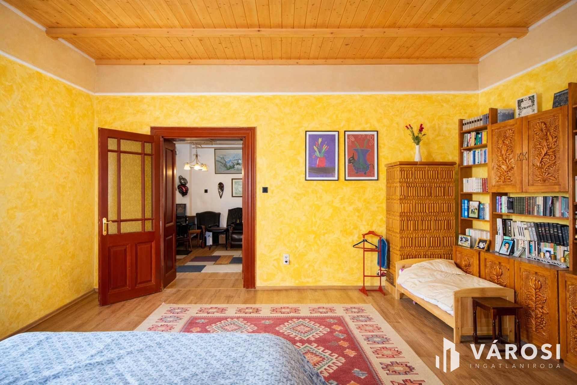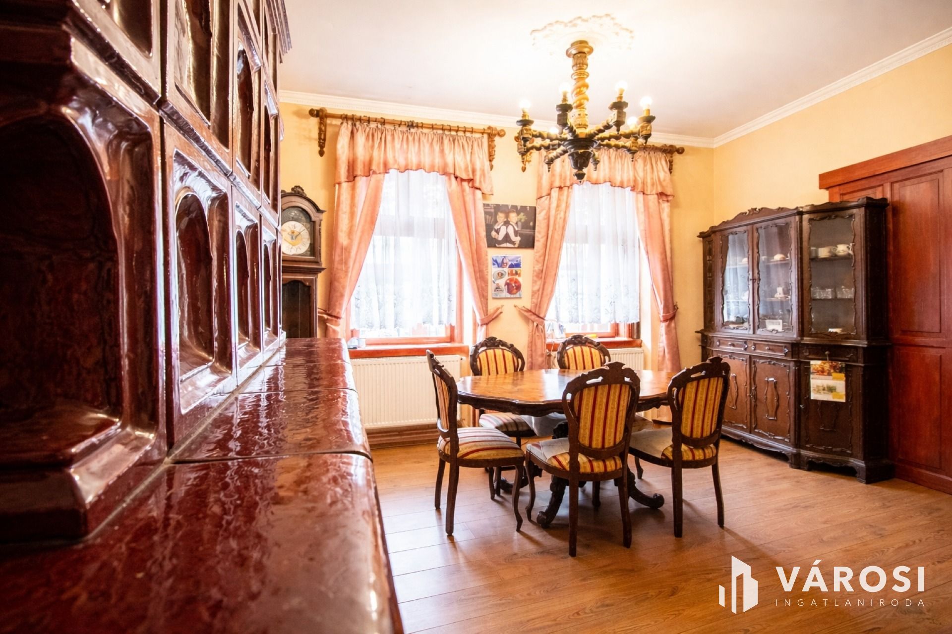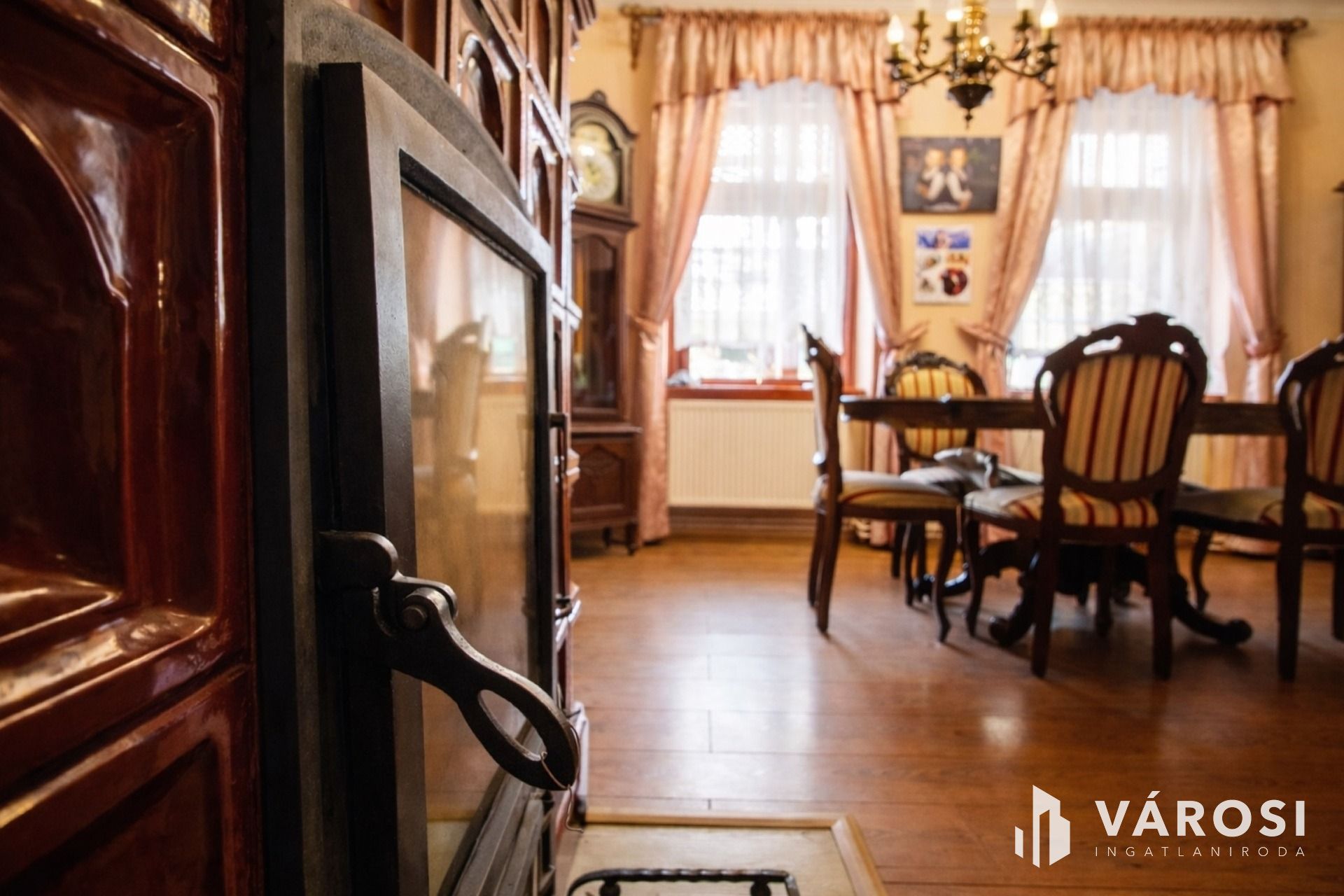 A nappali igazi ékköve a gyönyörű, pados csempekályha, amely nemcsak fűt, hanem meghatározza az egész tér hangulatát. Ugyanez a látvány visszaköszön az egyik utcai szobában és a konyha–étkezőben is, ahol egy extra méretű betöltőablakon keresztül figyelhető a tűz játéka, valódi, megismételhetetlen atmoszférát teremtve. A konyha és a fürdő már a modern igényeket szolgálja ki, miközben a nappali és a szobák berendezései, bútorai korhűek, elegánsak, és az egész házban következetesen őrzik a nagypolgári karaktert.