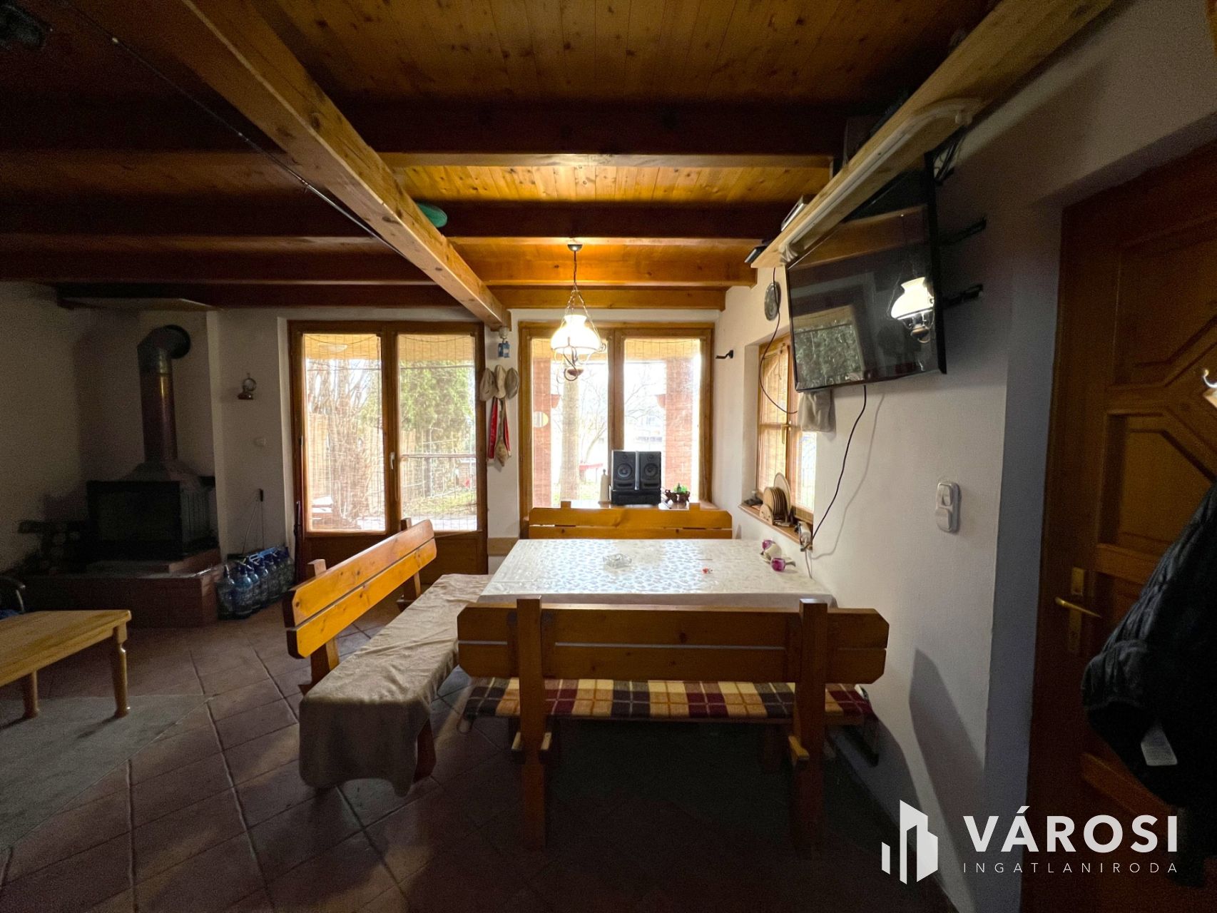 A természet közeliség megjelenik a házon belül is, sok faanyag került beépítésre, gerendázott mennyezete is az otthonosság érzetét növeli.