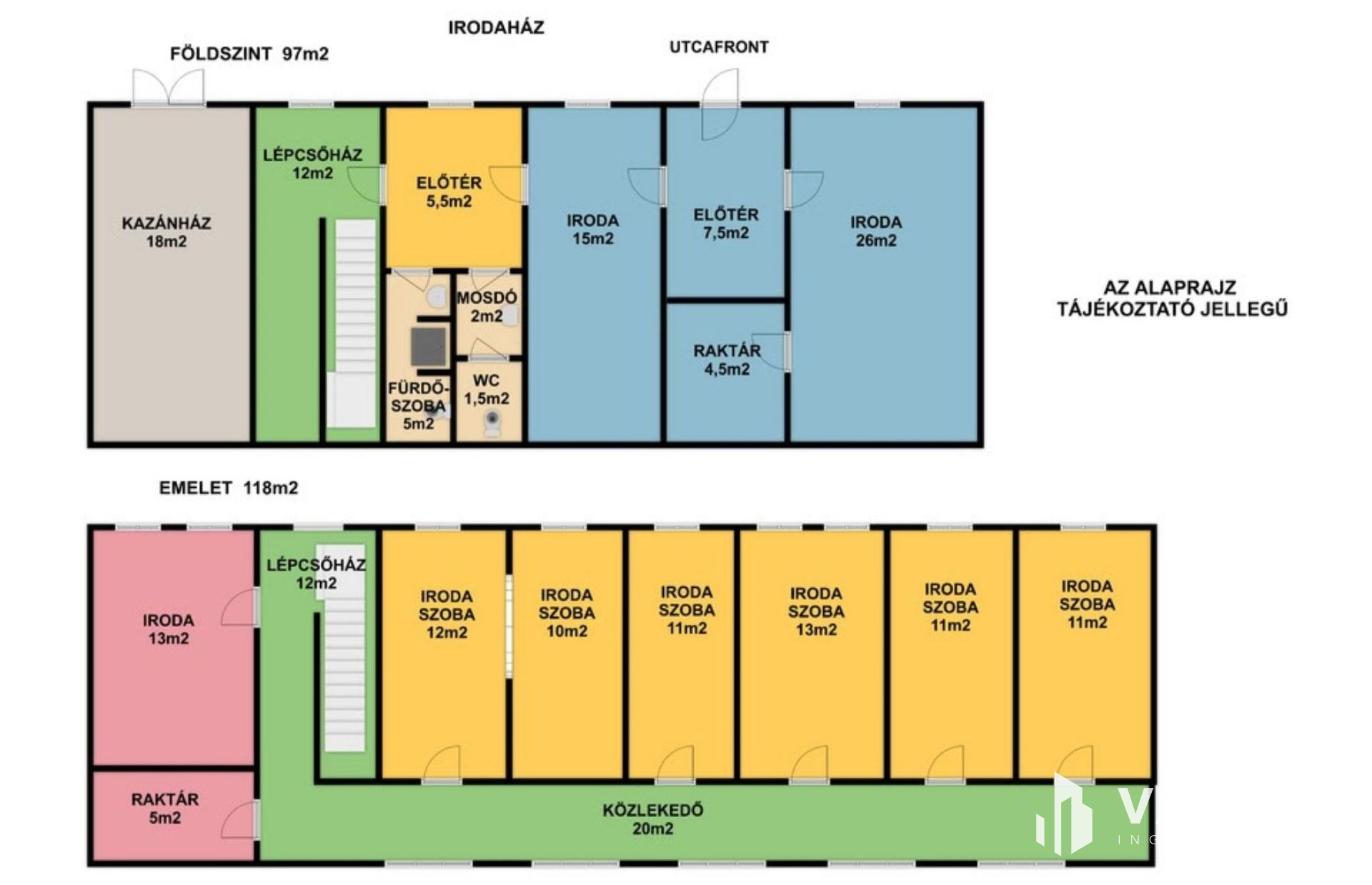 - Földszint helyiségei: két nagyobb szoba/iroda, előtér, mosdók, fürdőszoba, közlekedő, lépcsőház, kazánház.