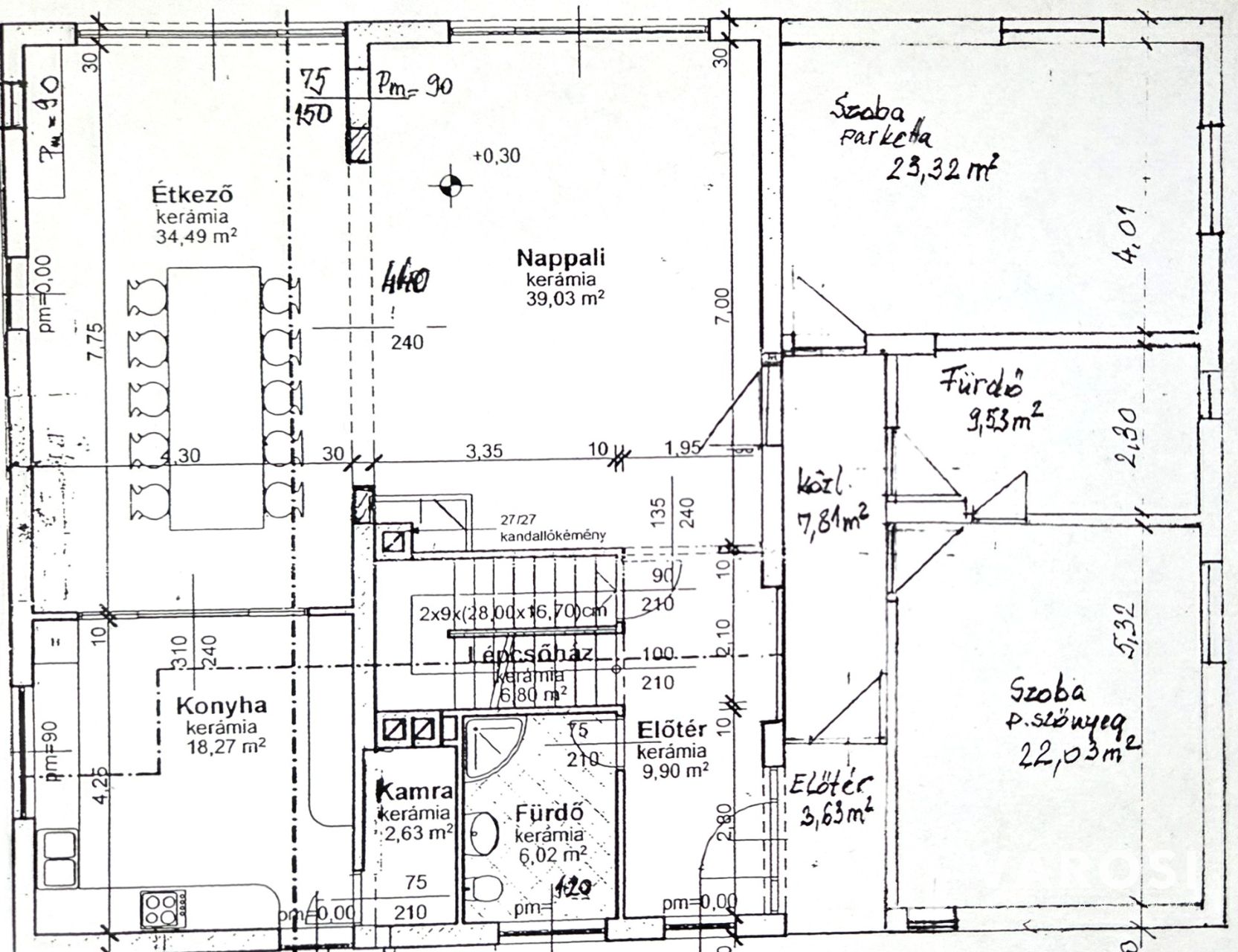 -Földszint: 2 nagyméretű szoba + 2 fürdőszoba+nappali+konyha+étkező+kamra+előtér